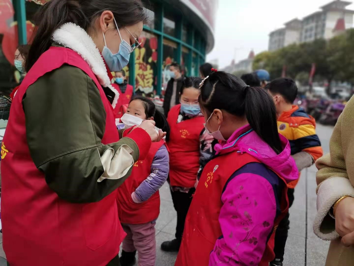 (图为孟柯辰同学帮助小朋友们佩戴胸章)