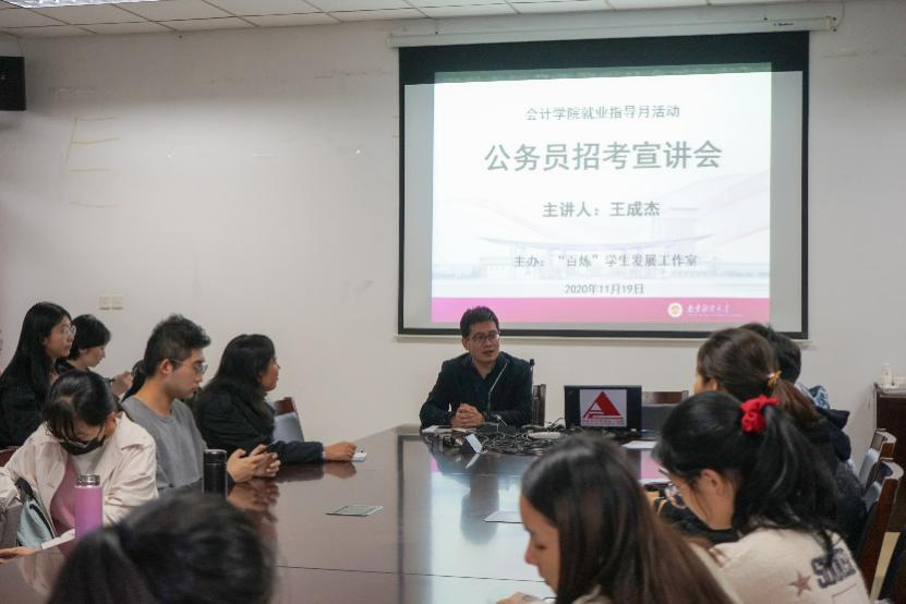 11月19日晚,伟德国际1949“百炼”学生发展工作室主办的就业指导月活动之公务员招考宣讲会在德济楼308会议室举行。