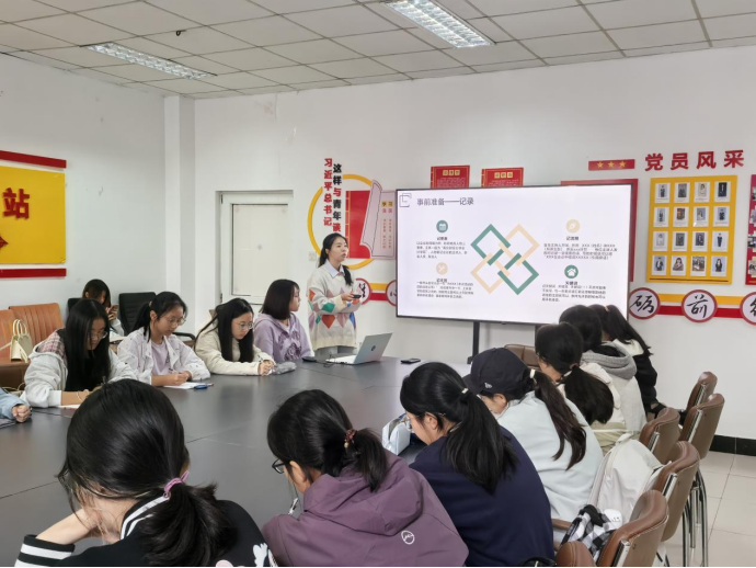 负责人谭语馨从事前准备、正式写作、事后修改三个方面为同学们介绍了新闻稿写作方法。她首先强调了事前记录的重要性,提出要学会记要素、记主旨、记流程以及关键词,为同学们提供了一些记录方法与技巧,并展示了自己的记录实例;然后向大家提出了正式写作时的要求,强调了新闻稿的三段式结构,开头、结尾以及语言的精简与规范;接着介绍了事后修改的流程与常见问题。最后,谭语馨以一篇新闻初稿作为实例,结合新闻稿写作方法,为同学们指出该篇稿件的不足之处,并提出修改建议。
