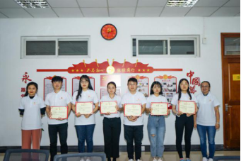 接下来是令人激动的研究生样板党支部微党课制作大赛的颁奖环节。研究生党支部指导老师郭瑞霞和曹学舟为获得三等奖的曲潇仪、郭宇欣、周志远、梁煜婷、杨沛璋和陈玉等6名党员颁奖。