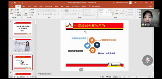 甘诺老师以生涯规划大赛的目的为切入口,鼓励同学们积极参赛的同时能树立起懂得规划自己人生的意识。分享了往届生涯规划大赛的学生作品,从经验视角为同学们分析如何才能在大赛中脱颖而出。
