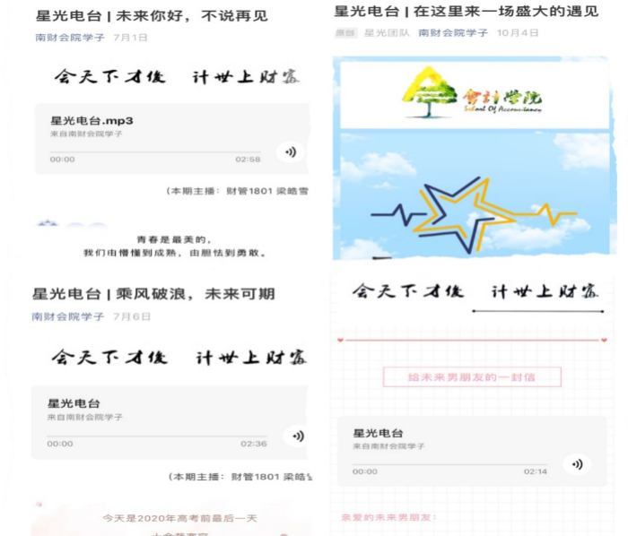 上线至今,“星光电台”针对大学生原生态家庭问题、人际关系,恋爱问题,自我成长,职业规划等热门问题,已分八期完成内容推送,以有声的方式“陪伴”和“倾听”,帮助同学们寻找自己的答案,探索自我成长的途径。其中,在“未来你好,不说再见”毕业季特辑中,毕业生纷纷暖心“告白”,借由电台的声音传递出自己的不舍和祝福,将一场离情依依的离别转变成对未来的期望。另外,“你.....要不要做我男朋友”的情感专题在同学中产生极大地反响,同学们纷纷转发,审计1902班吴仪同学表示:“我们受过这各种各样的教育,唯独缺少“爱”的教育,在电台中我们仿佛听到了自己的心声,找到了内心的共鸣,原来我们都是一样的在寻找真爱”。