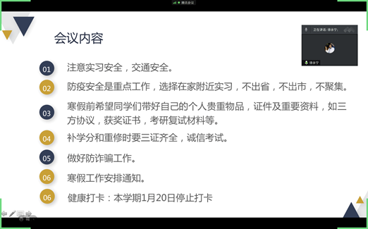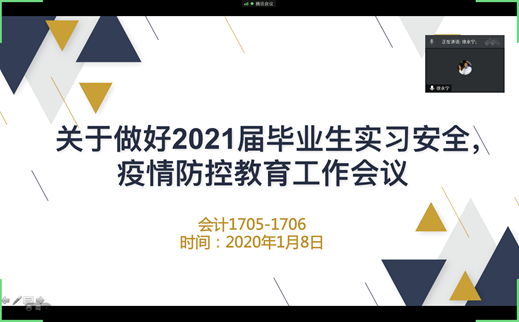 2021年1月8日,会计1705-1706班级在腾讯会议召开线上毕业生实习安全与疫情防控教育主题班会。本次会议由辅导员徐永宁老师、会计1705班长曹心如主持,班级全体同学共同参与。