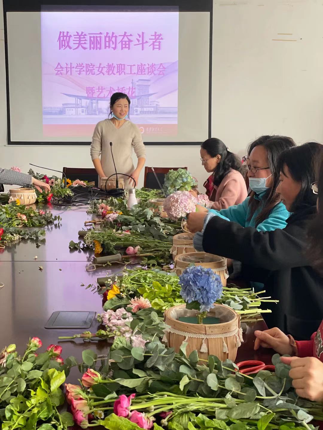 座谈会后,学院分工会邀请了专业的花艺老师,给参会的女老师们上了一堂生动、有趣的艺术插花课。在花艺老师的指导下,女老师用自己灵巧的双手,制作完成了一盆盆色彩缤纷、形态各异、摇曳多姿的艺术花篮。