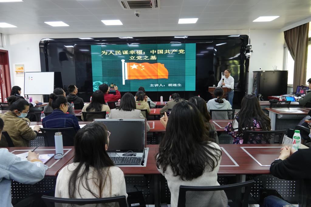 胡连生教授以“为人民谋幸福:中国共产党立党之基”为题,声情并茂地讲述了中国共产党人的初心和使命。他指出,“为人民谋幸福”内化为共产党人的坚定信仰和坚强意志,外化为共产党人的无私无畏、使命担当。长征时期的“半条被子”、三河坝阻击战、天心圩整顿,无不体现共产党人爱民情怀和严明纪律,以实际行动践行了“我是谁”“为了谁”的本质问题。胡连生教授用深入浅出的语言、精辟的论述以及大量丰富、详实的史料点燃了与会师生学习党史的热情。