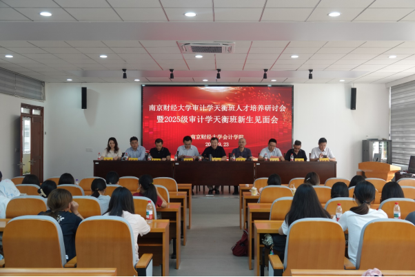 在代表发言环节,24级天衡班班主任胡晓明分享了首届天衡班的育人成果:24级天衡班通过“一生一策、双元育人”机制,实现了学业与职业素养的同步提升,英语四级全员达标、六级通过率70%,班级绩点及奖学金等级均显著领先其他班级;通过“班中有班”模式,组建“董秘虚拟方向班”并组织初级会计职称考试,全班在全国通过率仅20%的情况下实现100%通过;依托红色审计实践项目,全体师生赴江西、陕西等多地开展调研,成果获“学习强国”等主流媒体报道,暑期“三下乡”实践发表宣传稿件42篇,覆盖多平台。25级天衡班班主任朱海涛以“入主流、定好位、有特色”为核心寄语新生,他承诺将从学业辅导、竞赛备战、企业调研三方面履行班主任职责,助力学生形成“技术+实务”双重竞争力。24级天衡班学生代表曹樱译代表新生感谢学校与天衡所搭建的“人才特区”平台,表示将以24级学长学姐为榜样,主动钻研智慧审计工具、积极参与实习实践,努力成长为“跨界、智慧、职业型”高素质专业化审计人才。