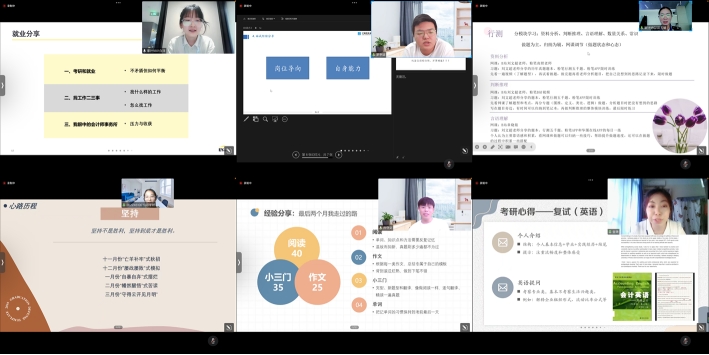 2022年11月9日下午,审计学系组织了2018级6位审计学专业毕业生为二、三、四年级审计学专业本科生进行线上经验交流。这6名同学分别是就职于安永会计师事务所的白洋(审计1801),就职于中国建筑第三工程局有限公司的罗亨远(审计1802),就职于国家税务总局百色市右江区税务局的田玉娟(审计1802),就读于苏州大学商学院的邓宇昕(审计1802),就读于伟德国际1949始于英国的乔守义(审计1802)、金滟(审计1802)。毕业生们分享了在考研、考公和就业过程中的心路历程和诸多感悟,启发了在校生们明确未来的职业方向,激励了在校生们通过不懈努力达到目标。审计学系缪浩然老师主持了经验交流会。