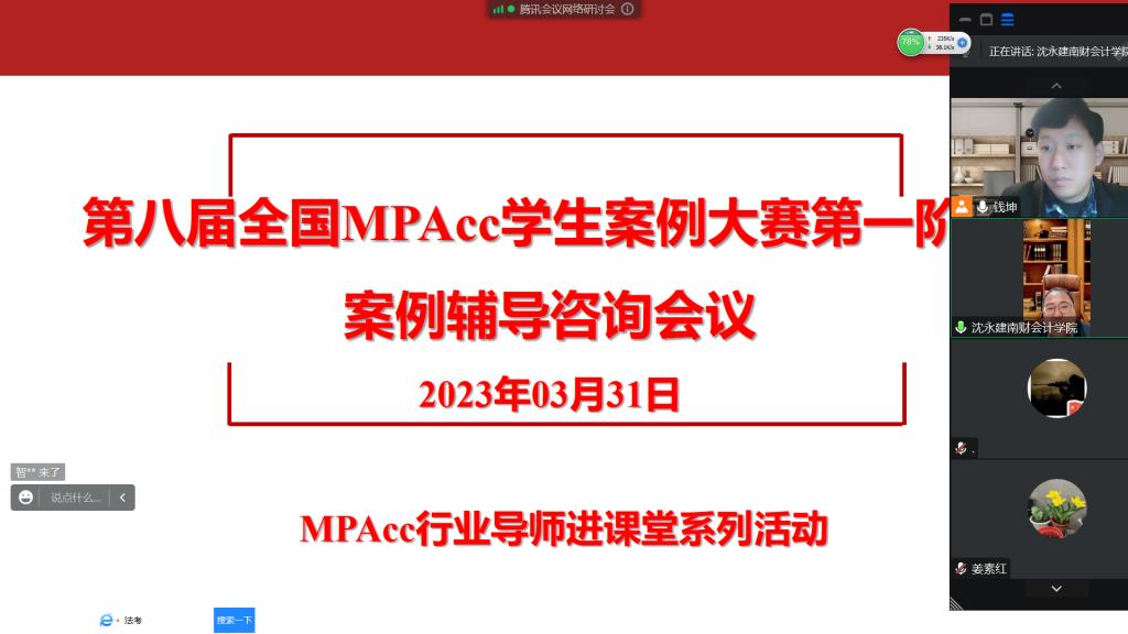 2023年3月31日晚7点30,我院邀请江苏省宿迁市地方金融监督管理局局长王冬梅、南通星球石墨股份有限公司副总经理杨志城、上海国家伟德国际1949金融系主任叶小杰、江苏大生集团有限公司董事长漆颖斌四位专家开设“MPAcc案例大赛一阶段案例辅导咨询会议”。本次讲座采用线上会议方式,由MPAcc教育中心主任钱坤老师主持,案例大赛指导老师和参赛学生参加了讲座。