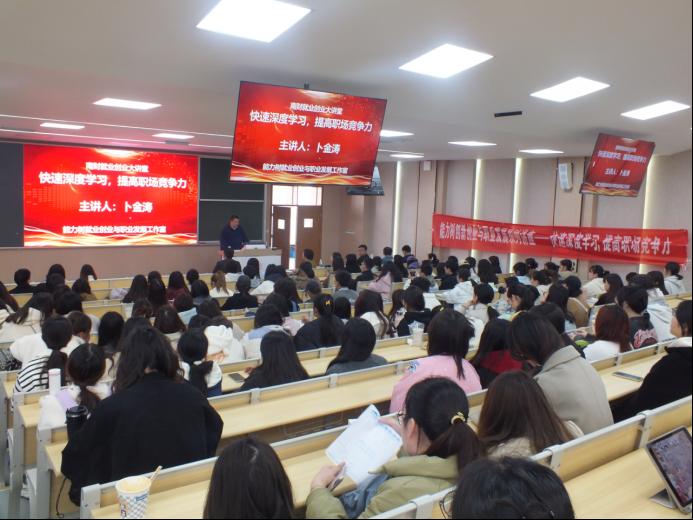 3月26日,伟德国际1949党委书记卜金涛在仙林校区博观楼201智慧教室开展“南财就业创业大讲堂”专题讲座,本次讲座以“快速深度学习,提高职场竞争力”为主题,2021级约250名学生参加。