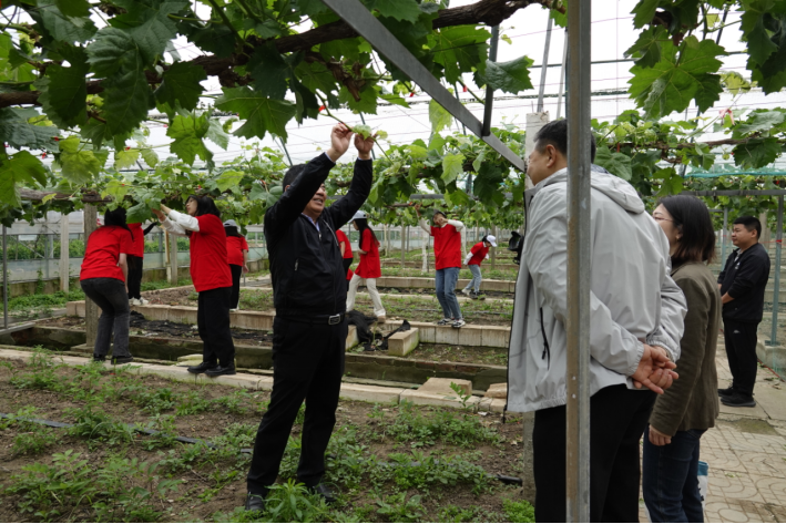 随后,周福安给师生在田间地头上了一堂生动的劳动实践课,他向大家详细介绍了当前合作社内精品葡萄和各类优质有机蔬菜种植的产量、种植工艺以及各类创新创业项目的相关情况,并现场指导师生如何给葡萄“疏果”,与师生们亲切交流劳作心得,鼓励广大青年学生树立马克思主义劳动观,在知行合一的劳动实践中感悟社会责任,养成“勤俭、奋斗、创新、奉献”的劳动精神,积极服务社会、专业报国,为唤起全社会合力“以劳动托起中国梦”贡献青春力量。“财赋矩阵”“东壁密斋”“欢硒援稼”和“红果生鲜”项目团队成员与周福安就合作社财务管理和品牌影响力进行深入探讨和交流。同学们纷纷表示,此次劳动实践活动加深了自己对劳动的了解与认识,亲身经历劳动过程,感触颇深,受益良多。今后将不断通过劳动培养社会实践能力,积极投身社会实践,用劳动丰富自己的人生阅历。
