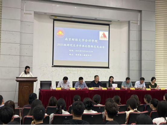 姚文韵副校长首先代表学校向2025级研究生致以热烈欢迎,并介绍了我校工商管理学科的建设进展。她指出,在2025软科中国财经类大学排名中,我校位列第10,工商管理学作为优势学科,入选软科“中国一流学科”。姚校长勉励新生尽快完成从知识接受者到学术探索者的转变,主动融入学术环境,提升自主研究与创新能力;希望同学们充分利用学校丰富的产学研平台,积极参与实践,通过系统化训练夯实专业基础,将所学所知转化为个人核心竞争力,拓宽成长路径,夯实未来发展的根基。