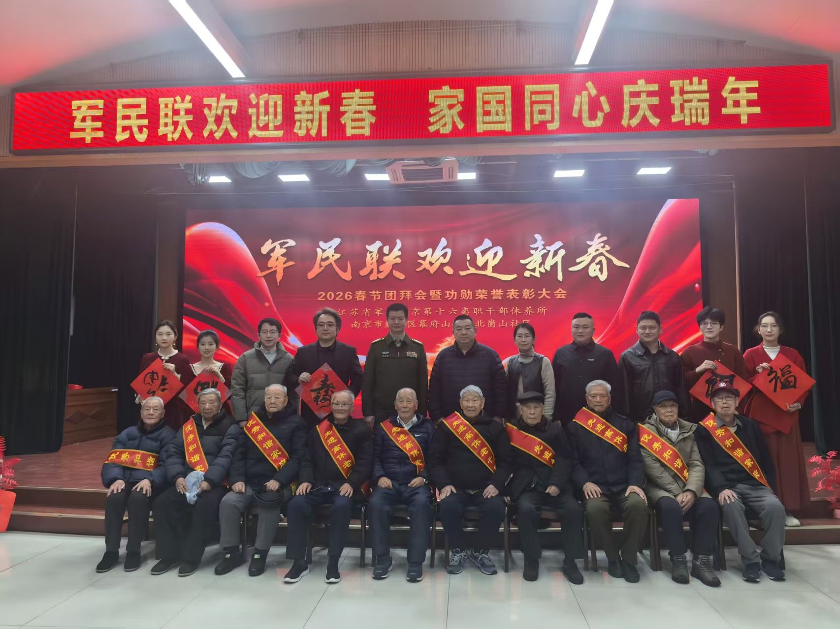 骏马迎春,福满人间。2月4日上午,伟德国际1949党委书记卜金涛、副书记布丹丹、辅导员及“丹心百炼”合唱团学生志愿者代表一行,前往江苏省军区南京第十六离职干部休养所,参加“军民联欢迎新春——2026年春节团拜会”,向军队离休老干部及官兵致以崇高的敬意与新春的祝福。学院师生与幕府山街道、鼓楼区人民法院、区退役军人事务局、关工委等共建单位代表欢聚一堂,与干休所老同志、官兵及辖区居民共贺新春。