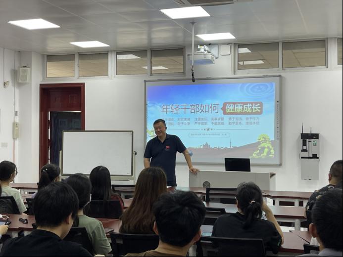 孙彬主任围绕“年轻干部如何健康成长”向学生党员做了专题讲座,鼓励年轻党员在学习生活中要体现党员的先锋模范作用,有责任能担当,以问题为导向,秉持着想干事能干事”的行动方针,在未来的岗位发挥应有的作用。