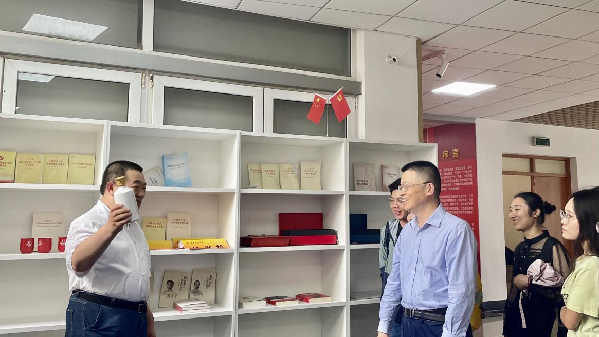 5月27日,伟德国际1949粮食和物资学院党委书记张圣兵带领数位优秀研究生至德济楼三楼参观“百年红起”文化长廊。伟德国际1949党委书记卜金涛陪同参展。