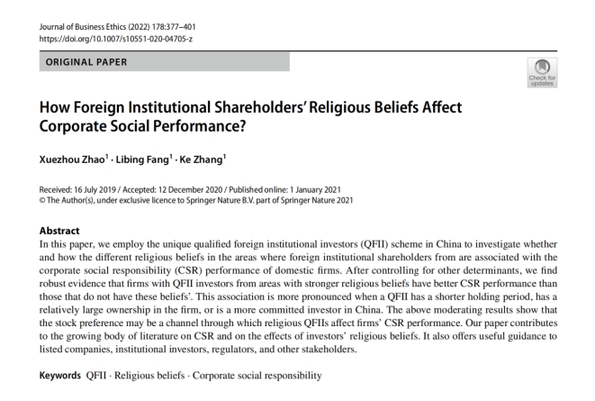 Xuezhou Zhao, Libing Fang, and Ke Zhang, 2022. How Foreign Institutional Shareholders’ Religious Beliefs Affect Corporate Social Performance? Journal of Business Ethics 178: 377–401.