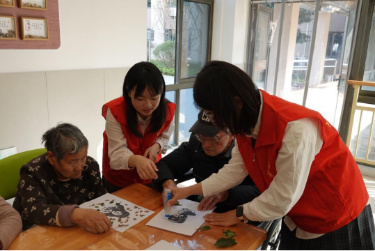 “学习雷锋好榜样,忠于革命忠于党……”伴随着志愿者们深情而有力的朗诵声,《忆雷锋,树新风》的篇章在颐养院内缓缓展开。随后,经典歌曲《外婆的澎湖湾》、《茉莉花》、《我爱你中国》旋律响起,老人们被深深感染,不由自主地跟着哼唱起来,现场氛围温馨而感人。此外,小剧场《雨夜送大娘》《车站的温暖》更是以生动再现的方式,将雷锋的经典故事娓娓道来,以生动具象的方式诠释了雷锋精神的内涵。志愿者们还贴心地为老人们带来了广播体操与太极拳表演,通过这两项传统而又充满活力的运动,传递着健康生活的美好理念。表演结束后,志愿者们与老人们亲密互动,共同制作创意手工树叶画。一片片色彩斑斓的叶子,在志愿者们的巧手下,被剪裁成了雷锋头像的粘贴画,这不仅是对雷锋精神的深刻致敬,更是对新时代青年责任与担当的生动展现。同时,志愿者们还与老人们亲切交谈,详细询问他们的身体状况和日常生活情况,传递着满满的关爱与温情。