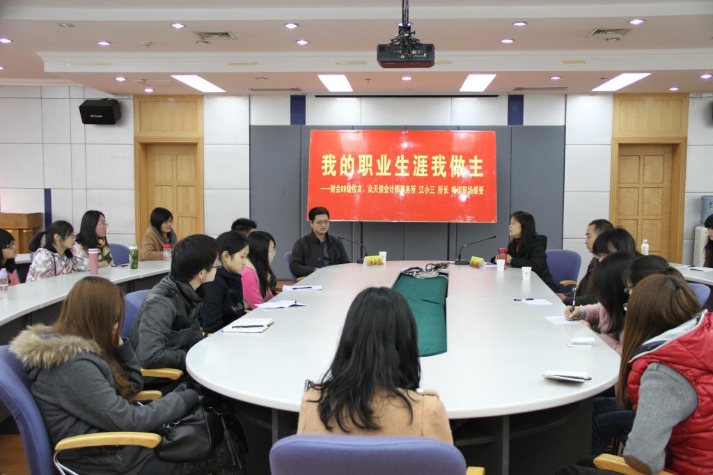 2012年11月30日,我校财会89级校友、众天会计师事务所所长江小三先生在我校福建路校区综合楼217会议室为伟德国际1949大三学子作了题为“我的职业生涯我做主”专题报告。我院学工办张小燕老师主持报告会。